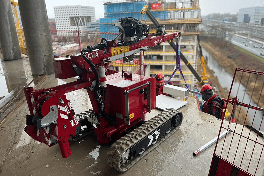 Der Mini-Hebekran C1 hat eine Hebekapazität von 550 kg, ideal zum Heben von schweren Baumaterialien und Glaswänden in engen Räumen. Die funkferngesteuerte Bedienung ist einfach zu handhaben. Alles, was der Kran wahrnimmt, wird auf dem Display der Fernbedienung angezeigt. So weiß der Benutzer immer, wie viel Hebekapazität die Maschine verwendet, welcher Auslegerwinkel eingestellt ist und beispielsweise das Gewicht am Haken.